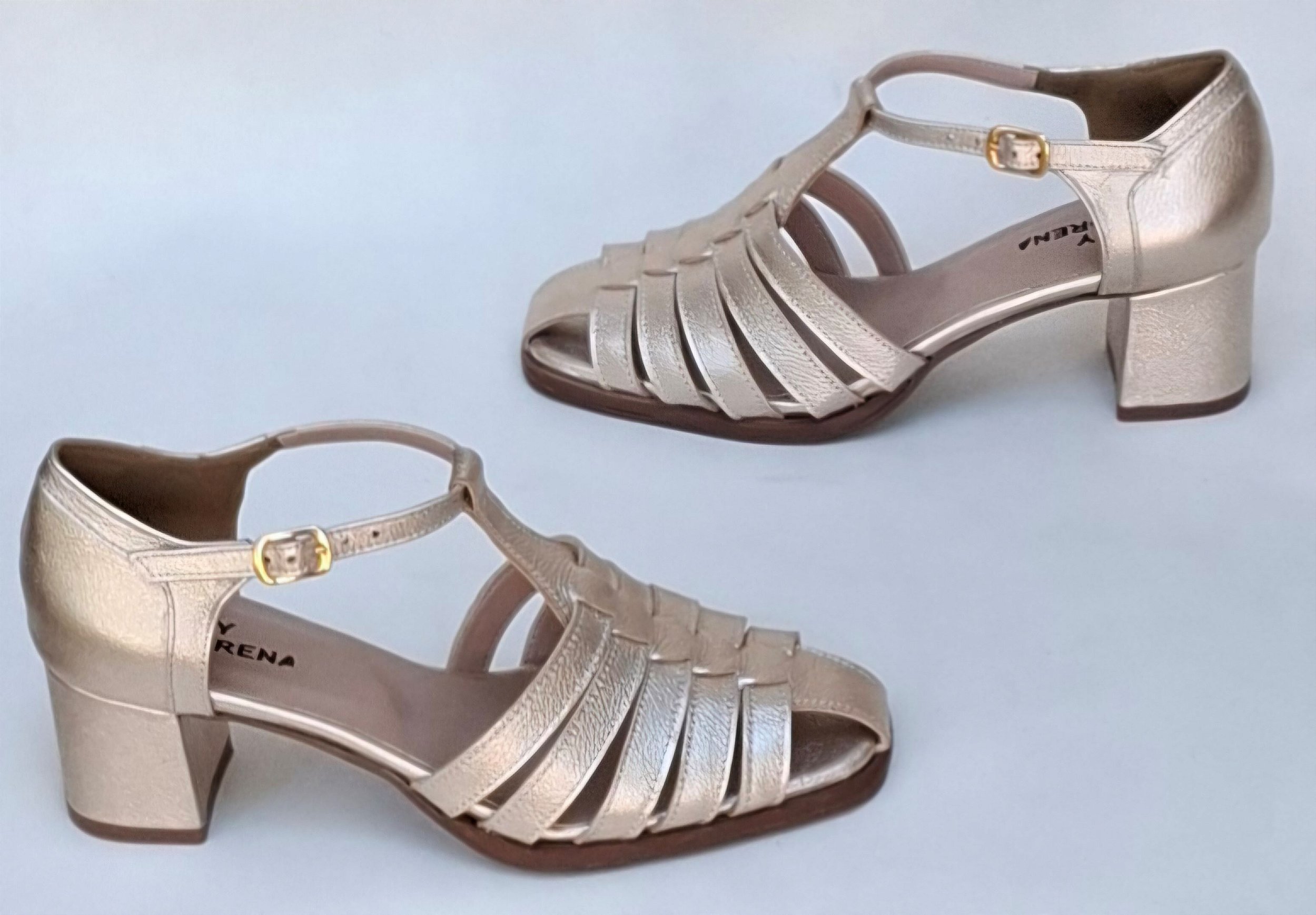 Sandália calcanhar fechado,salto 5 centímetros de couro champanhe, solado antiderrapante