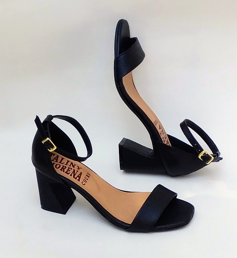 Sandália calcanhar fechado,salto bloco 8 centímetros de couro preto, solado antiderrapante